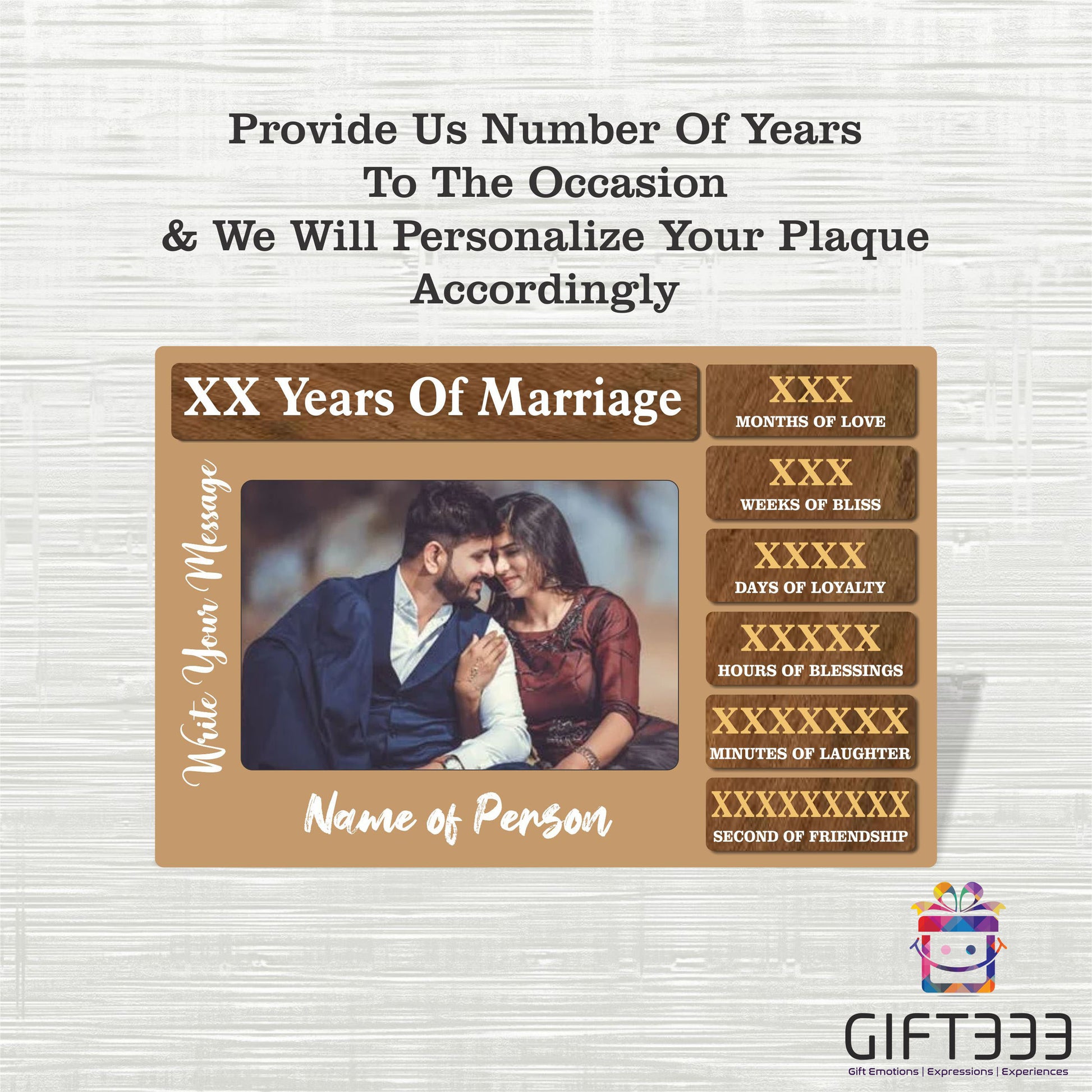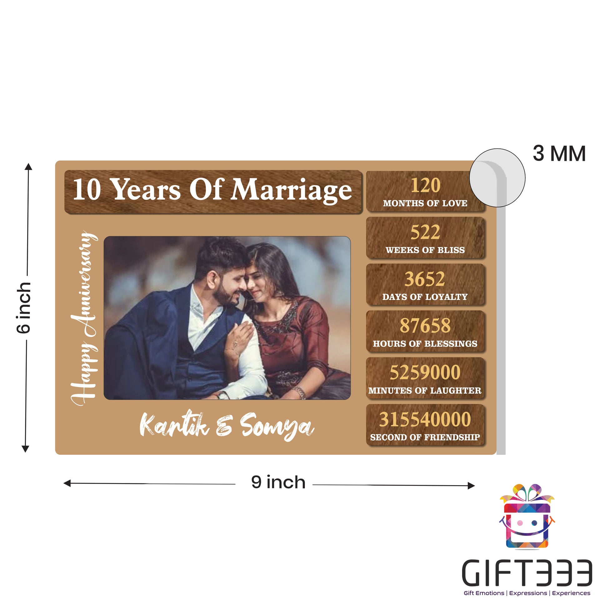 Size of the plaque is 6 X 9 Inches (15 X 22.5 CMS). Plaque thickness is 3 mm. Celebrate your special day with a gift that is truly one-of-a-kind. Gifteee offers an Anniversary Plaque that can be personalized with photos and names, making it the perfect keepsake for your loved ones. This beautiful plaque features an acrylic base and allows you to print photos, along with special messages, in order to capture and cherish all the memories from your special day. There's something extraordinary about receiving a gift that has been customized just for you. It shows that the giver put thought and effort into creating something unique and meaningful. With our Anniversary Plaque, you can do just that. Add personal touches like your names, a special date or even a heartfelt message to make it an unforgettable gift. Photos are the perfect way to relive precious moments and create lasting memories. With our Anniversary Plaque, you can now turn those memories into a beautiful display piece that can be cherished for years to come. Print multiple photos and display them on the plaque, along with special messages or quotes, to create a one-of-a-kind gift that will be treasured forever. If you're looking for a unique and meaningful gift for your anniversary, look no further than our personalized Anniversary Plaque. It combines the sentimentality of photos with the personal touch of customizations, making it the perfect way to celebrate your special day. Surprise your loved ones with this beautifully crafted plaque and show them just how much they mean to you.